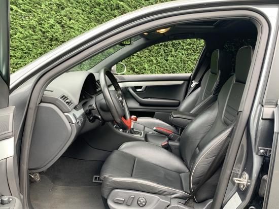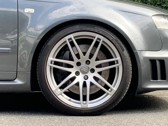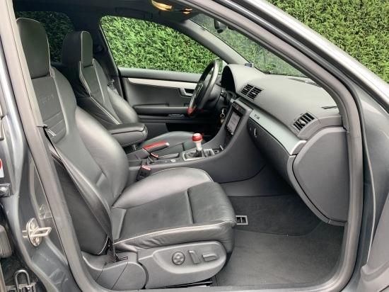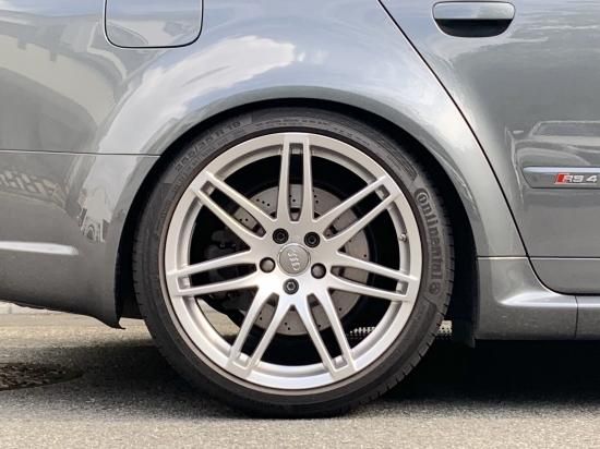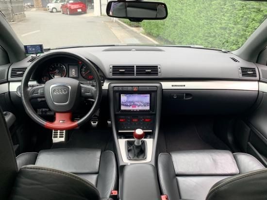 初代B5型RS4はアバントのみのボディスタイルでしたが、当個体B7型RS4はアバントだけでなく、セダンも製造されました。ハニカムメッシュグリルやワイドフェンダー、楕円形テールパイプなどRSならではのスタイリングが特徴です。当時はRSモデル専用色だったデイトナグレーの外装も艶があり、良い状態を保っています。