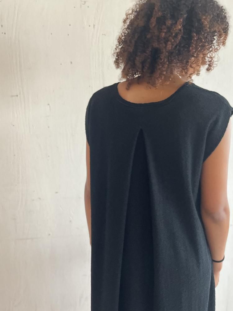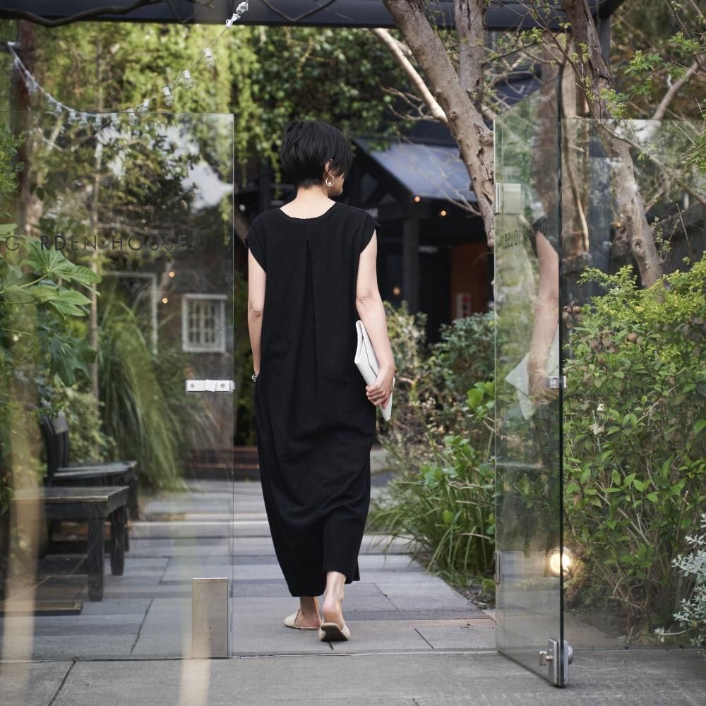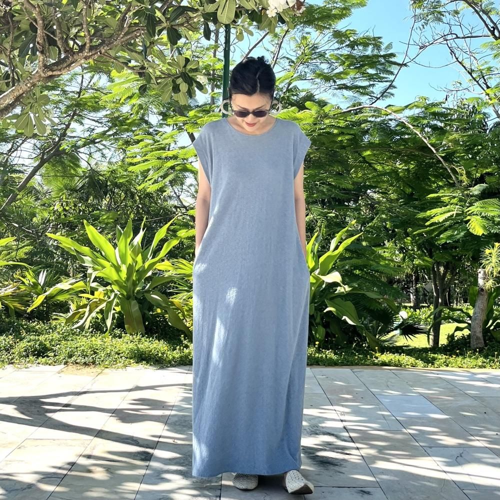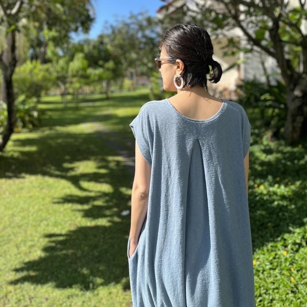背中に入れたタックから流れるドレープが特徴で、体のラインが響かないよう生地分量を大きく取ったマキシ丈は、動くたびになびき、リゾート感のあるシルエットを作ります。