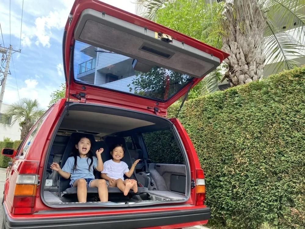 また当個体は希少な格納式サードシート付となり、万が一の7人乗車や、バックドアを開けてのベンチとしてご活用頂けます。(サイズ感の目安に、6歳と4歳の子供に座ってもらった写真を載せてあります)