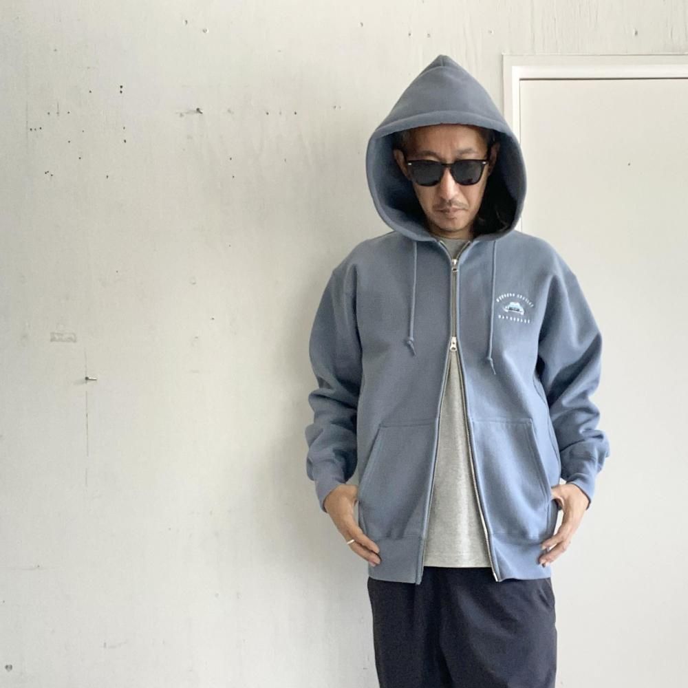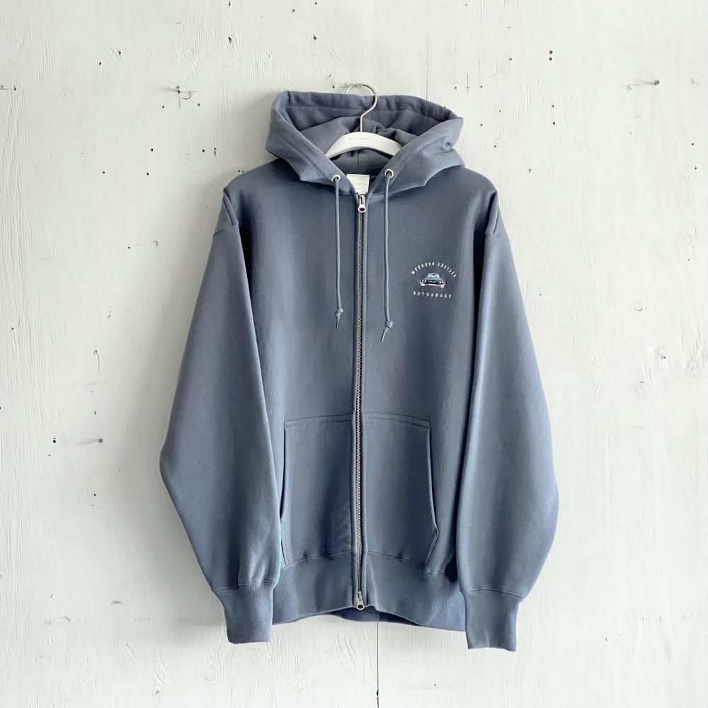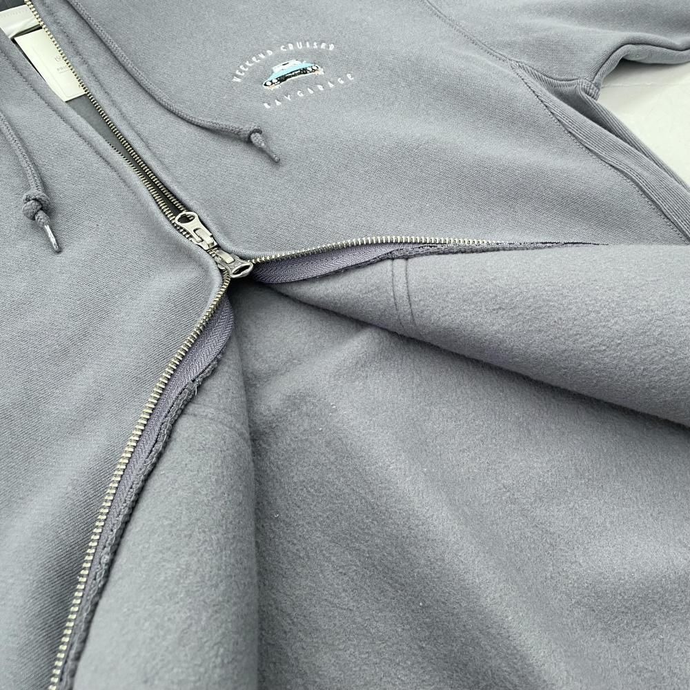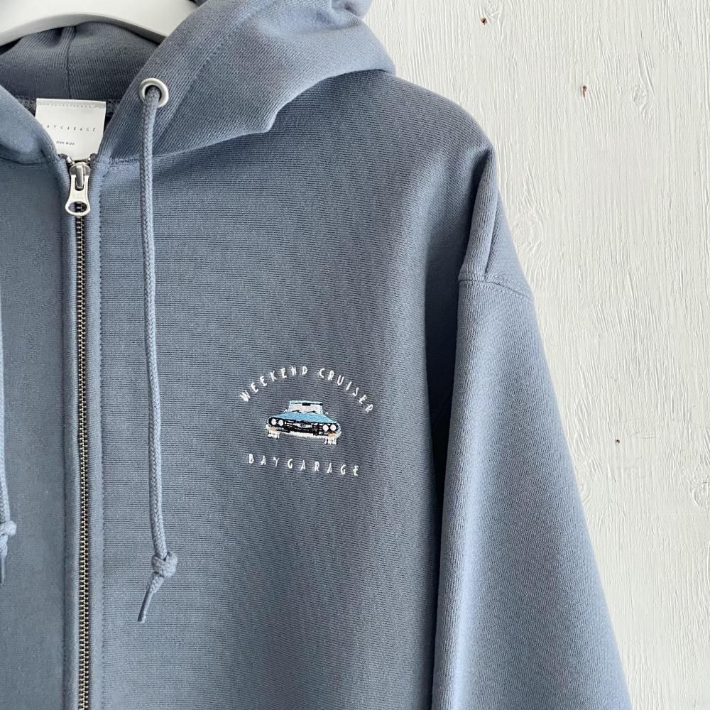 胸にワンポイントの刺繍を施したジップアップフーディ。