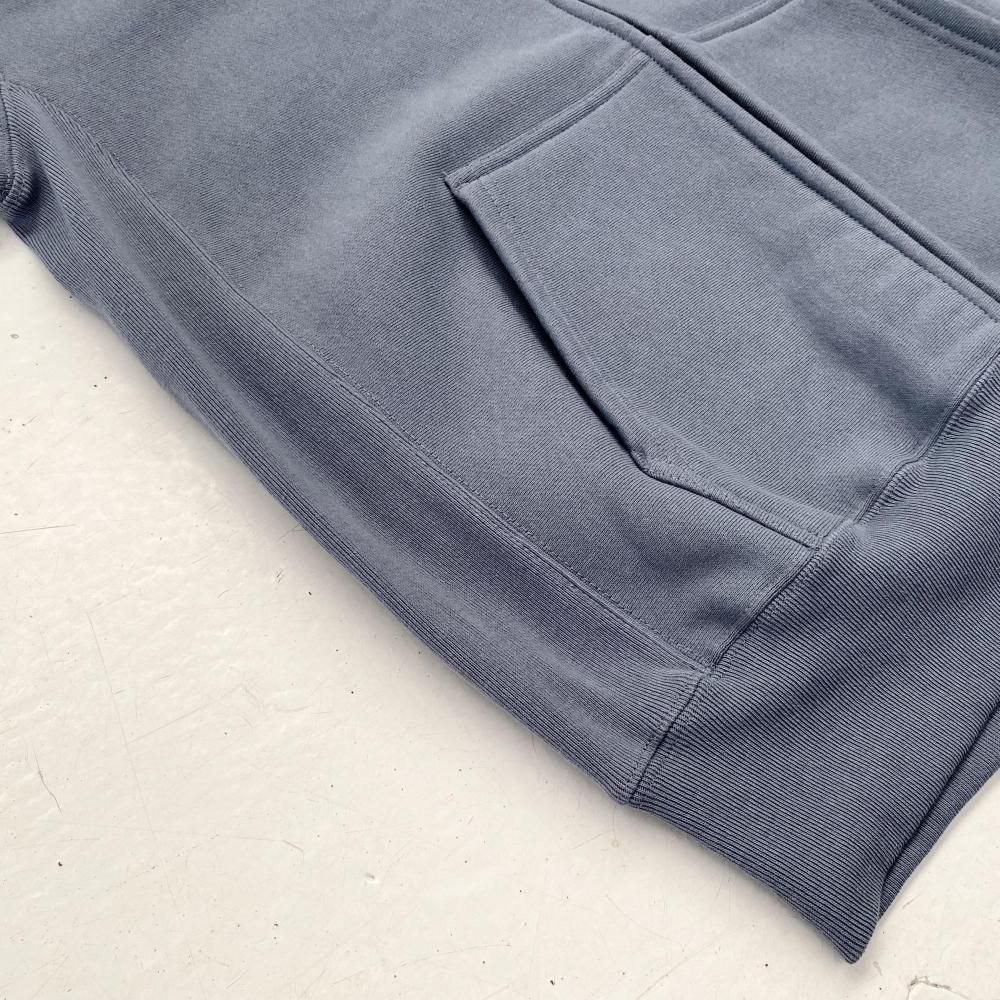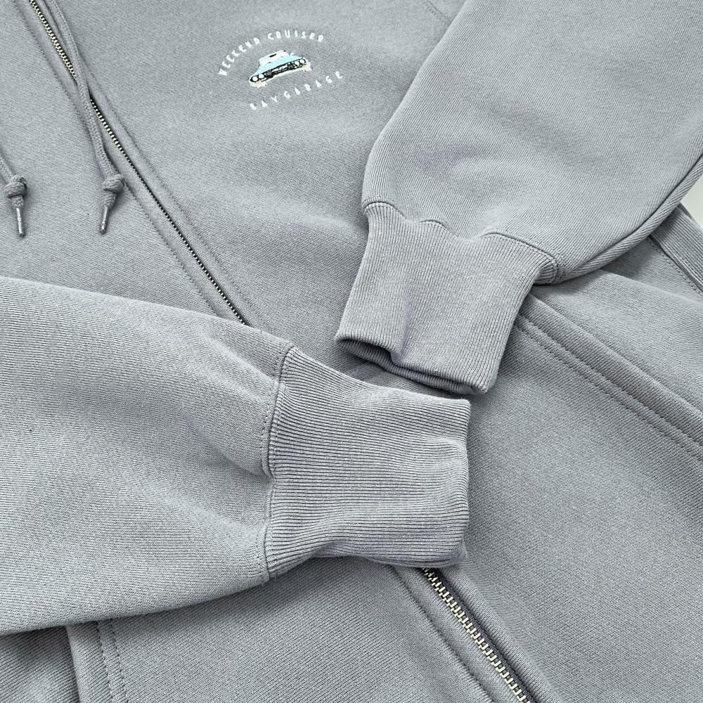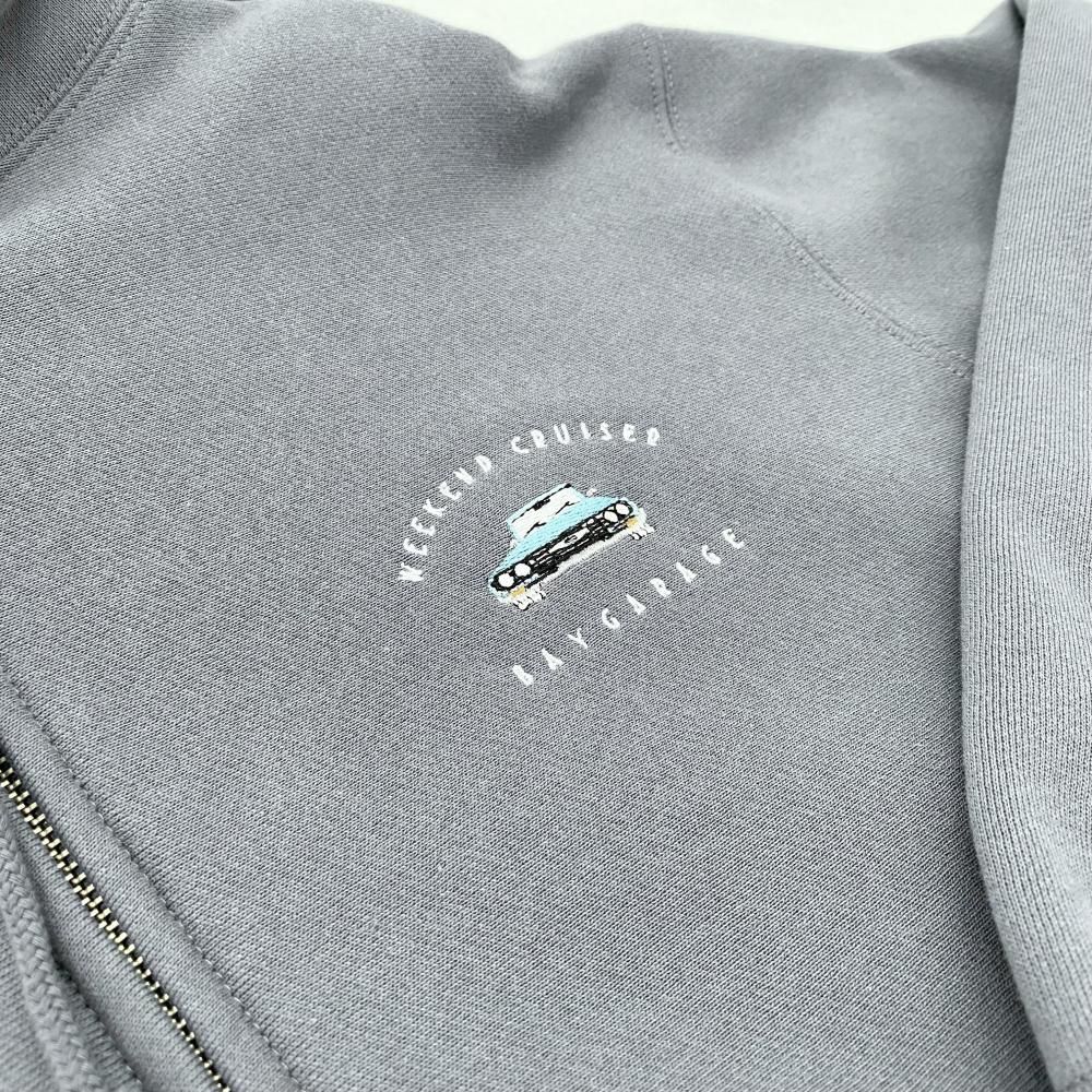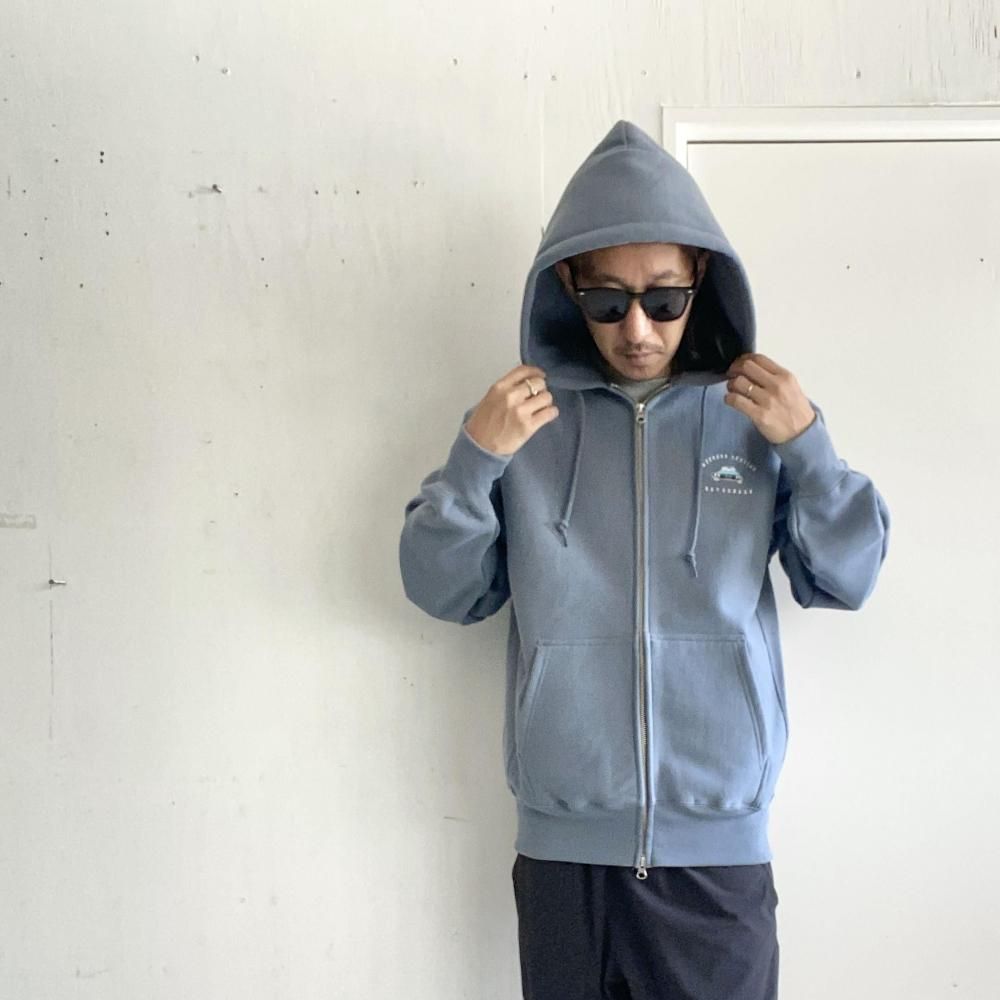 胸にワンポイントの刺繍を施したジップアップフーディ。
